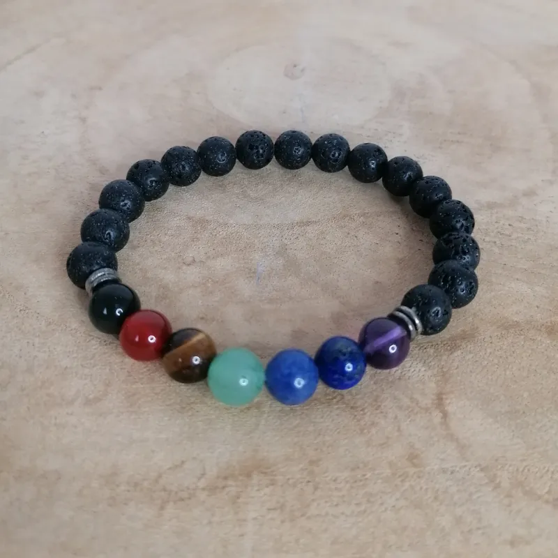 Découvrez un bracelet puissant et symbolique, composé majoritairement de pierres de lave naturelles, sublimées par 7 perles représentant les 7 chakras.